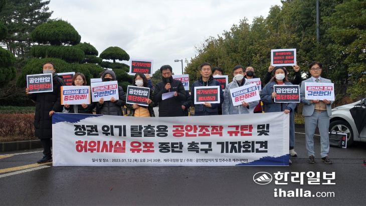 공안탄압 저지 및 민주수호 제주대책위가 12일 제주 국정원 앞에서 기자회견을 열고 있다. 김도영기자