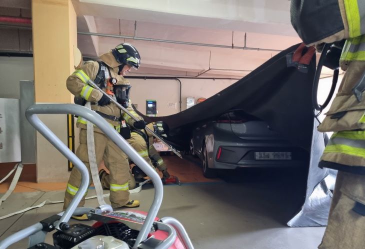 서부소방 대원들이 질식소화포와 수벽형성관창을 이용한 전기차 화재 진압 훈련을 실시하고 있다. 서부소방서 제공