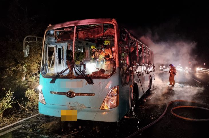 17일 오후 9시3분쯤 서귀포시 안덕면 평화로에서 발생한 버스 화재를 소방대원들이 진압하고 있다. 서부소방서 제공