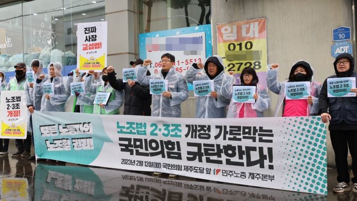 민주노총 제주본부는 13일 국민의힘 제주도당 앞에서 노조법 개정을 촉구하는 기자회견을 열었다.