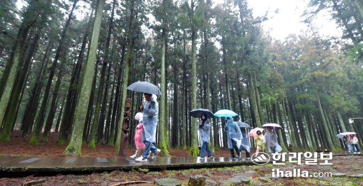 13일 비가 내린 절물자연휴양림을 찾은 탐방객들이 우산을 쓰고 걸어가고 있다. 이상국기자