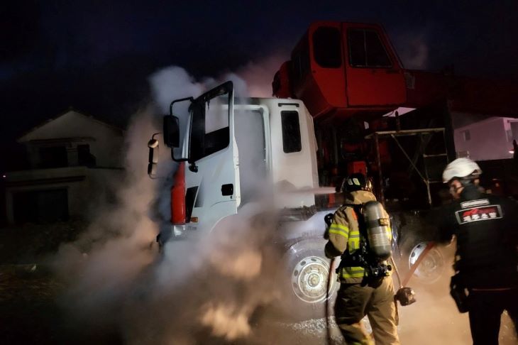 21일 제주시 오등동에서 발생한 카고크레인 화재를 소방대원들이 진화하고 있다. 제주소방서 제공