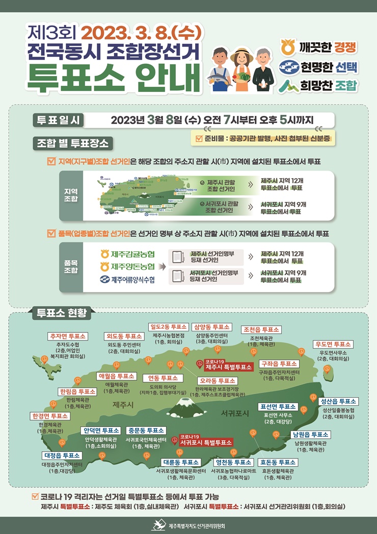 [한라일보]3월 8일 치러질 제3회 전국동시조합장선거는 도내 21개 투표소에서 치러진다. 도내 32개 조합 중 무투표 조합을 제외한 25개 조합의 선거인도 확정됐다.