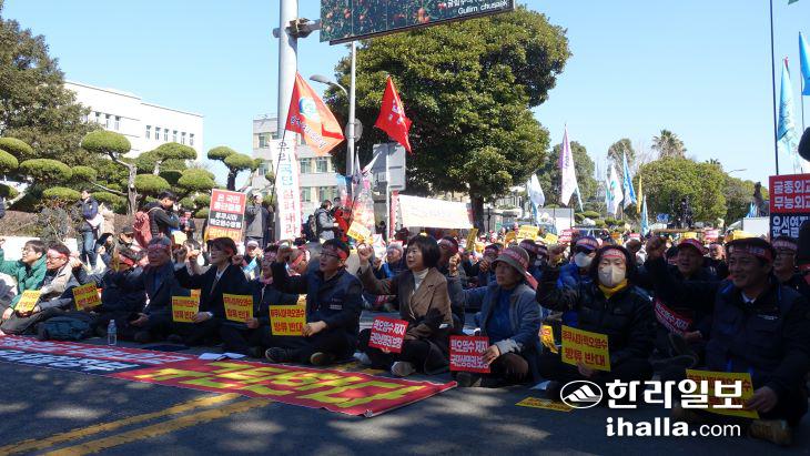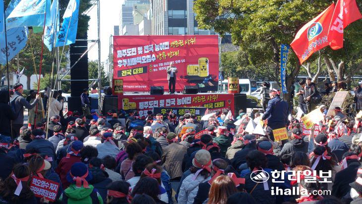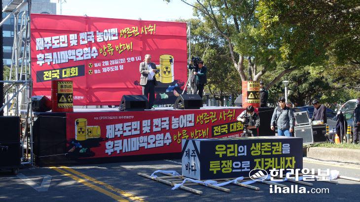 28일 제주도청 앞에서 '제주도민 및 전국 농·어민 생존권 사수 후쿠시마 핵오염수 방류 반대 전국대회'가 진행되고 있다. 김도영기자