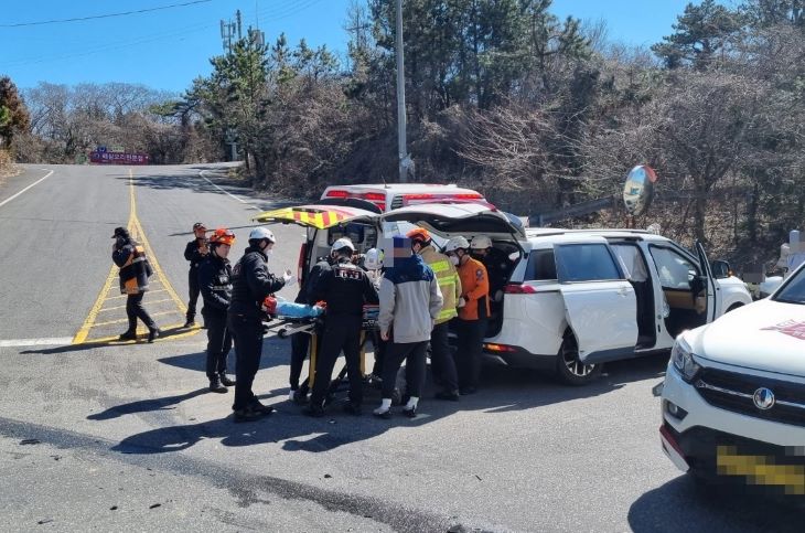 28일 제주시 애월읍 평화로 원동교차로 인근에서 발생한 교통사고 현장에서 구급대원들이 부상자를 이송하고 있다. 서부소방서 제공