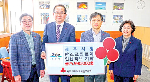 제주시는 2020년도 탄소포인트제 인센티브(상품권) 미지급분 2599만원을 6일 제주특별자치도 사회복지공동모금회(회장 강지언)에 지정 기탁했다. 이번 기탁금은 인센티브 지급분 중 기부를 희망하거나 이사·수취인 불명 등의 사유로 지급하지 못한 금액(상품권)으로 관내 사회복지시설 58개소에서 전액 사용될 예정이다.