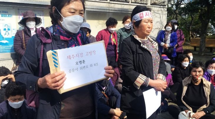 7일 제주지방검찰청 앞에서 월정리 해녀회와 불법 동부하수처리장 반대 비대위 등이 기자회견을 열고 있다.