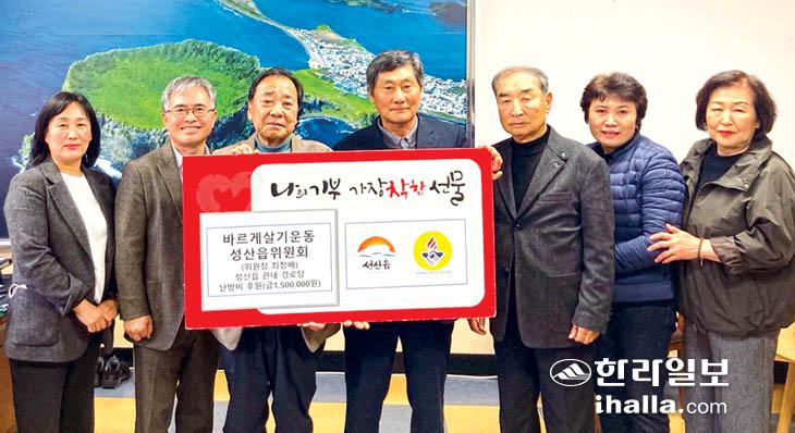 바르게살기운동성산읍위원회(위원장 최창배)는 지난 7일 서귀포시 성산읍(읍장 현동식)을 방문해 지역 내 어르신들의 활기찬 노후 생활을 위해 성산읍노인회(회장 강공식) 소속 경로당 15곳에 난방비 150만원을 기탁했다. 바르게살기운동성산읍위원회는 지역주민의 복지 향상을 위해 노력하고 있으며 앞으로도 꾸준한 기부와 사회복지 증진활동을 약속했다.