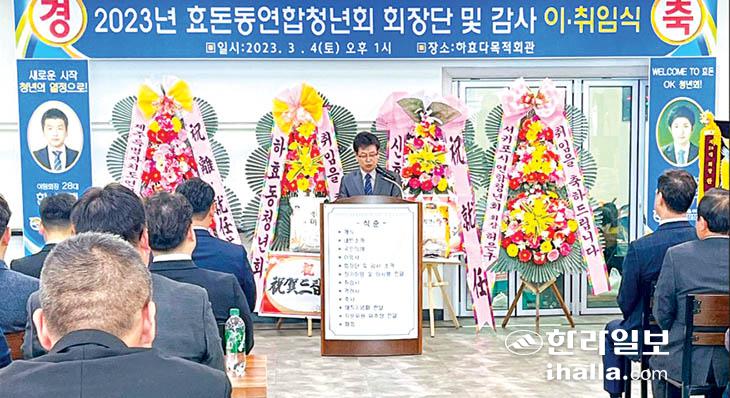 서귀포시 효돈동연합청년회(회장 현정환)는 지난 4일 하효다목적회관에서 청년회원 및 지역주민 60여 명이 참석한 가운데 2023년도 효돈동연합청년회 회장단 및 감사 이·취임식을 개최했다.