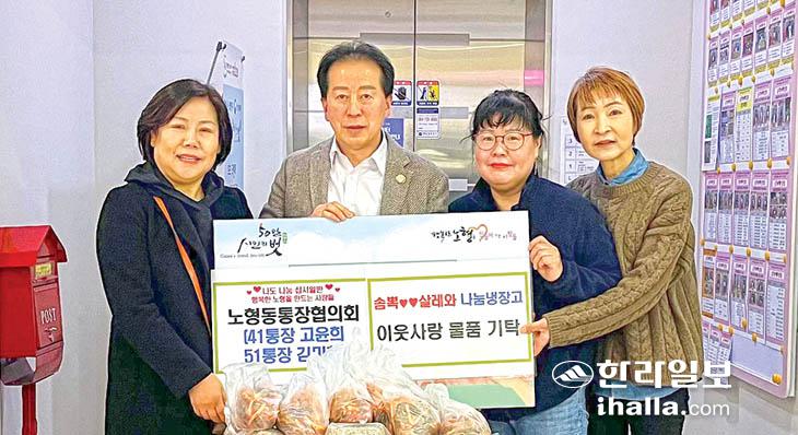 제주시 노형동통장협의회(회장 고영남) 41통장(고윤희)과 51통장(김미화)은 지난 7일 노형동주민센터(동장 김신엽) 1층에 설치된 '솜뽁♥♥ 살레와 나눔 냉장고'에 건강 관리 취약 계층을 위한 흑찰보리쌀, 양배추, 쪽파, 파김치 등 농산물을 전달했다.