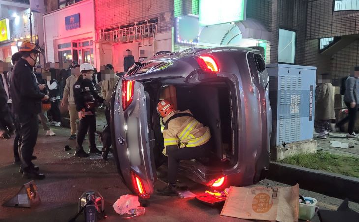 지난 10일 단독 교통사고로 전도된 차량에서 119 구조대원들이 탑승자를 구조하고 있다. 제주소방서 제공