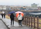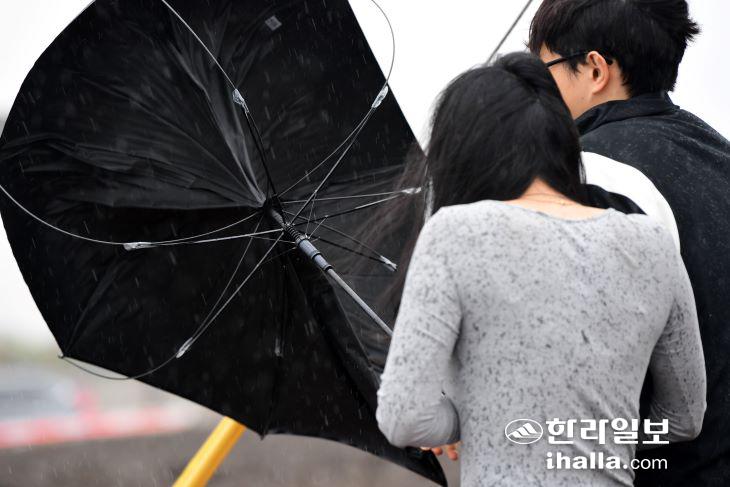 12일 제주시 도두동 해안도로에서 행인이 비와 강풍으로 힘겹게 걸어가고 있다. 강희만기자