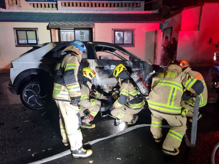 16일 제주서부소방서 등에 따르면 지난 15일 오후 6시56분쯤 제주시 애월읍 하귀2리에서 2022년식 아이오닉5 전기차 화재가 발생했다.