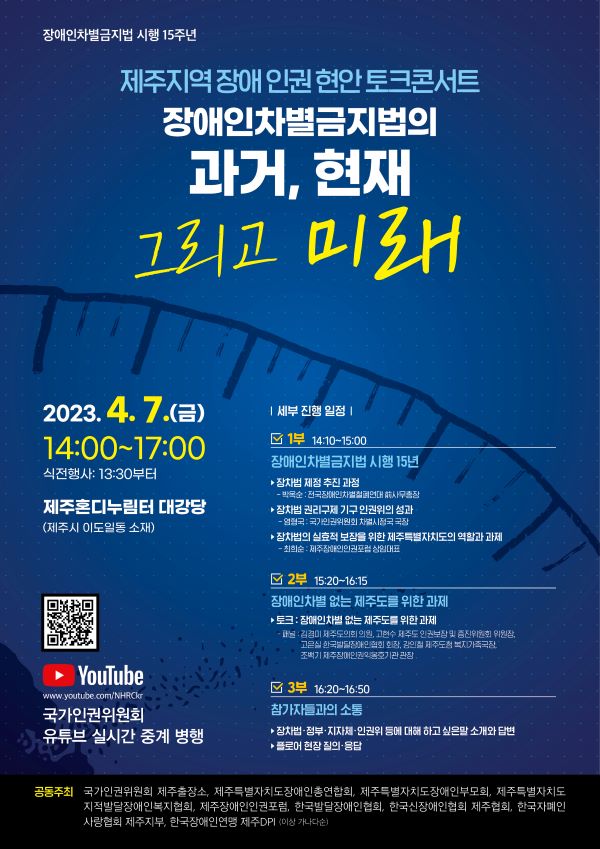 [한라일보] 국가인권위원회 제주출장소는 '장애인차별금지 및 권리구제 등에 관한 법률'(이하 장애인차별금지법) 시행 15주년을 맞아 오는 7일 오후 2시 제주혼디누림터 대강당에서 토크콘서트를 개최한다고 5일 밝혔다.