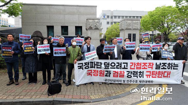 공안 탑압 저지 및 민주수호 제주대책위원회가 6일 제주지방검찰청 앞에서 기자회견을 열고 있다. 김도영기자