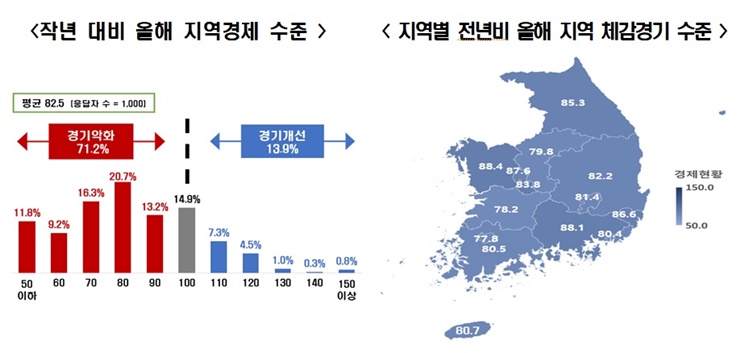 올해 평균 체감경기 수준은 작년의 82.5%에 그쳤다. 모든 지역에서 경기 악화를 전망했는데 광주(전년 대비 77.8%) ▷전북(78.2%) ▷충북(79.8%) ▷부산(80.4%) ▷전남(80.5%) ▷제주(80.7%) ▷대구(81.4%) ▷경북(82.2%)은 전국평균보다 낮았다.