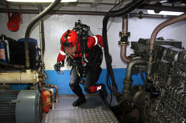 이상인 제주해양경찰서장이 11일 제주항 해경 부두에서 진행된 선박 전복 사고 대응 훈련에서 선내 진입로를 개척하고 있다. 제주해양경찰서 제공