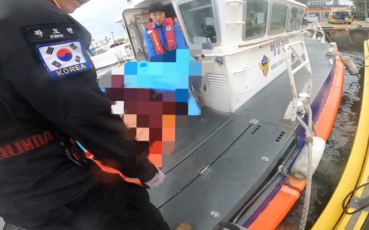 지난 11일 제주 비양도에서 발생한 80대 응급환자를 제주해경 대원들이 경비함정으로 이송하고 있다. 제주해양경찰서 제공