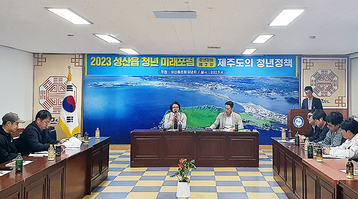 성산읍연합청년회(회장 김상현)는 지난 17일 성산읍사무소 회의실에서 지역 청년 30여명이 참석한 가운데 '제주도의 청년 정책'을 주제로 청년 미래포럼 강좌를 개최했다. 이날 강사로 나선 현기종 도의원은 "청년이 성산읍 발전과 번영의 중심이 돼야 한다"며 청년 교육의 필요성과 지원을 강조했다.