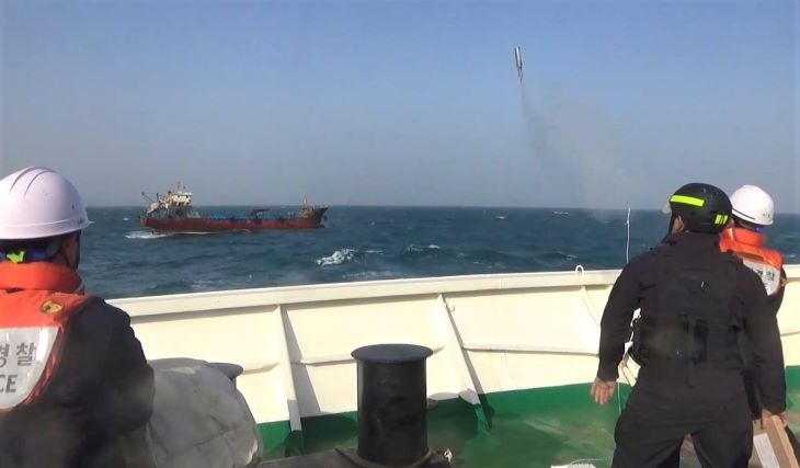 제주해경 3002함 대원들이 고장 화물선 A호를 예인하기 위해 투색총을 발사하고 있다. 제주해양경찰서 제공
