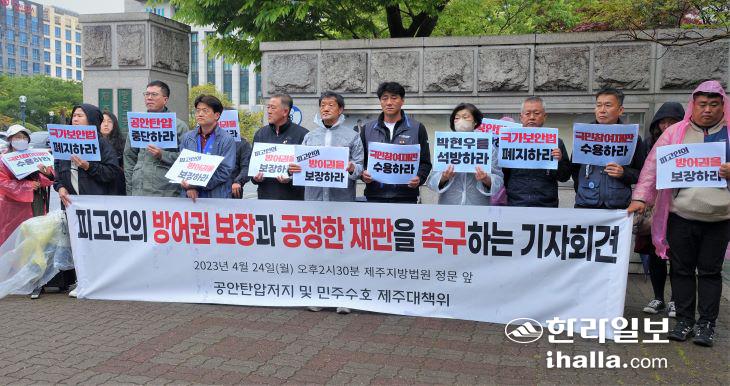 공안탄압저지 및 민주수호 제주대책위와 간첩조작 사건 변호인단은 24일 제주지방법원 앞에서 기자회견을 열고 있다.