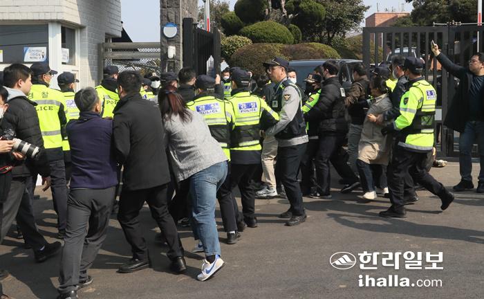 지난달 4일 제주교도소 앞에서 '공안탄압 저지 및 민주수호 제주대책위' 등이 국가보안법 위반 혐의로 구속된 박현우 진보당 제주도당 위원장을 호송차를 막아서며 경찰과 충돌하고 있다. 한라일보DB