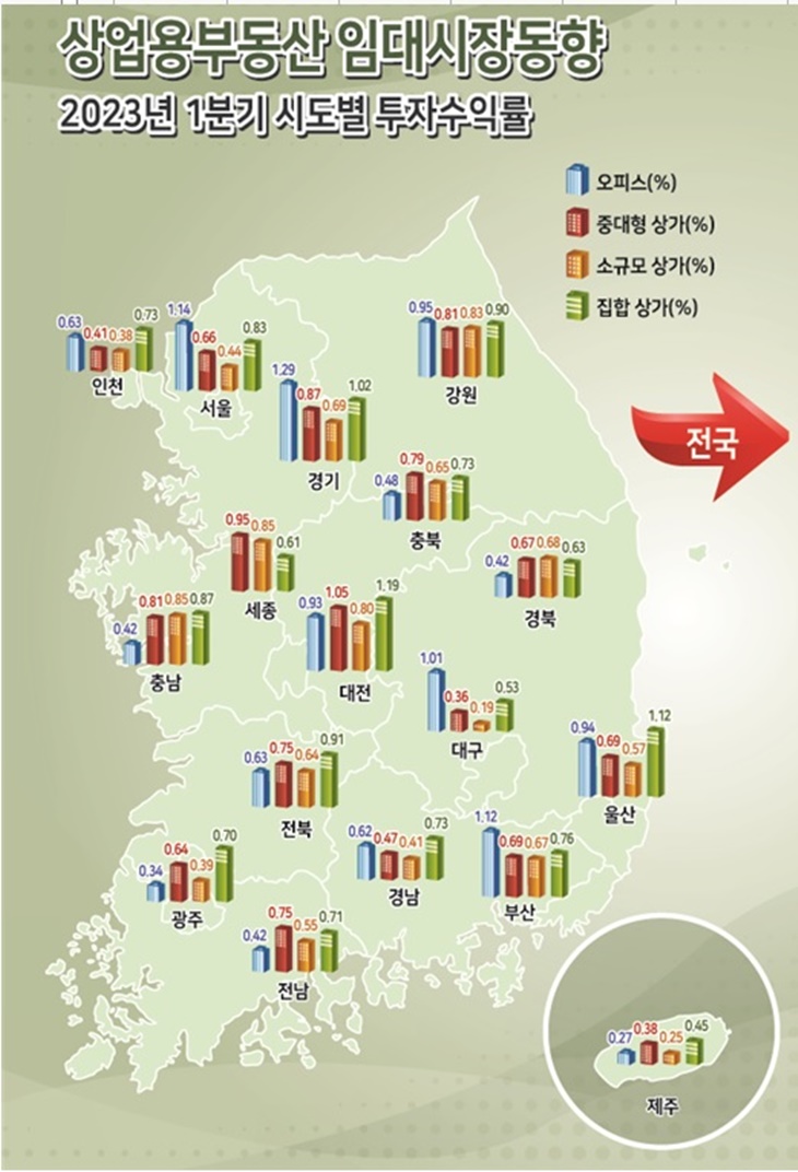 제주지역 상업용부동산 공실률은 전국평균과 비교하면 집합상가(전국 9.3%)를 제외하면 모두 전국평균(오피스 9.5%, 중대형상가 13.3%, 소규모상가 6.9%)보다는 낮은 수준이다.