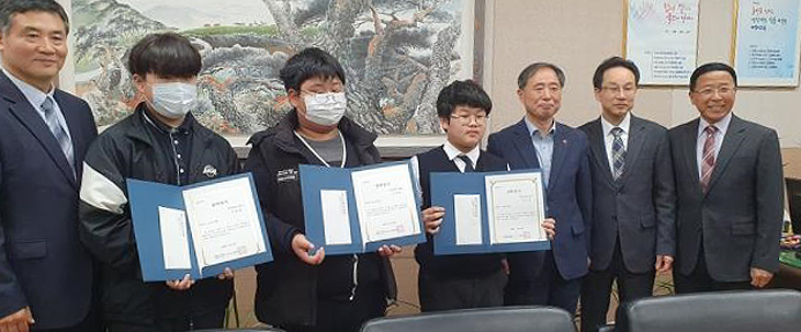 저청중학교(교장 소대진)는 지난 25일 교장실에서 1학년 1명, 2학년 1명, 3학년 1명의 학생에게 제주성지교회에서 지원하는 장학금을 전달했다. 이날 제주성지교회(목사 노경천) 관계자들은 학교를 방문해 학생들을 격려했다.