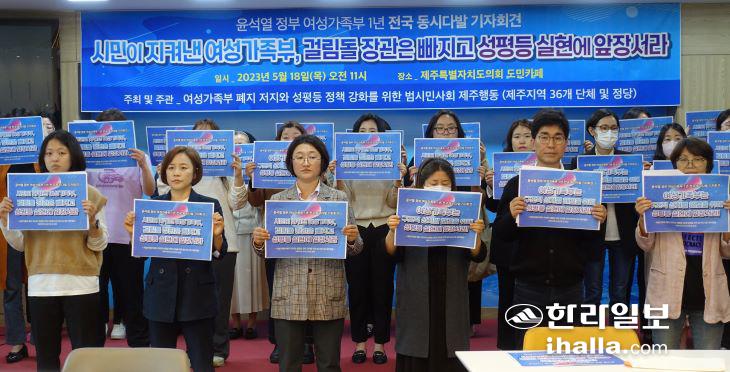 [한라일보] 제주지역 36개 단체와 정당이 모인 '여성가족부 폐지 저지와 성평등 정책 강화를 위한 범시민사회 제주행동'(이하 제주행동)은 18일 제주도의회 도민카페에서 기자회견을 열고 "시민이 지켜낸 여성가족부, 걸림돌 장관은 빠지고 성평등 실현에 앞장서라"고 말했다.