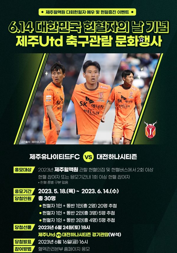 이번 문화이벤트는 제주도내 다회 헌혈자 예우 및 헌혈참여 활성화를 위해 마련됐으며 헌혈자 총 30명을 추첨해 동반인과 함께 6월 24일 오후 6시 제주월드컵경기장에서 열리는 프로축구 제주유나이티드 홈경기 대전전에 초청한다.