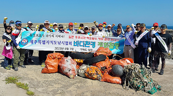 제주특별자치도낚시협회(회장 김억조)는 지난 3일 임원 30여명이 참석한 가운데 가파도 일원에서 바다환경정화활동을 펼쳤다.