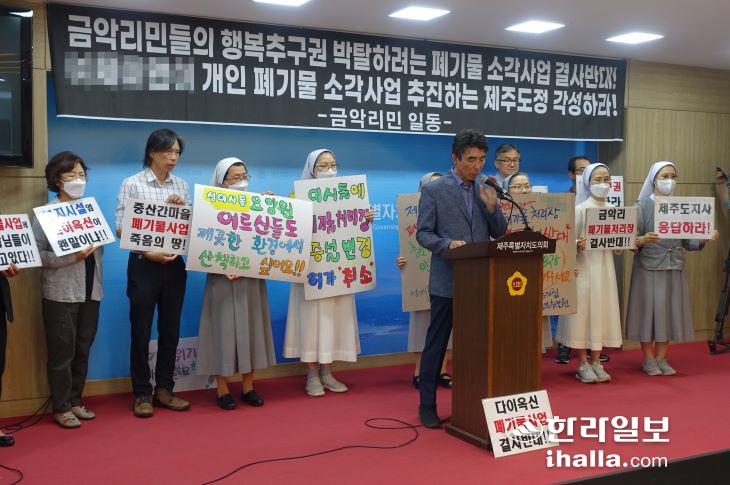 폐기물 소각사업 결사반대 금악리 비상대책위원회 관계자들이 13일 제주도의회에서 기자회견을 열고 있다.