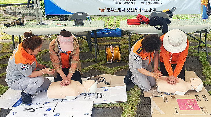 제주동부소방서 성산의용소방대(대장 김법수·홍재영)는 최근 성산읍 한마음 체육대회에서 지역주민을 대상으로 심폐소생술, 자동제세동기(AED) 사용법 등에 대한 안전교육을 실시했다.