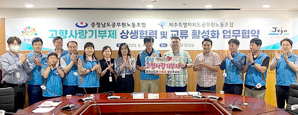 제주특별자치도공무원노동조합(위원장 오태권, 이하 제공노)과 충청남도공무원노동조합(위원장 최정희, 이하 충남노)은 최근 충남도청 중회의실에서 고향사랑기부제 활성화 및 2025 APEC 정상회의 제주유치 홍보를 위한 업무 협약을 체결했다.