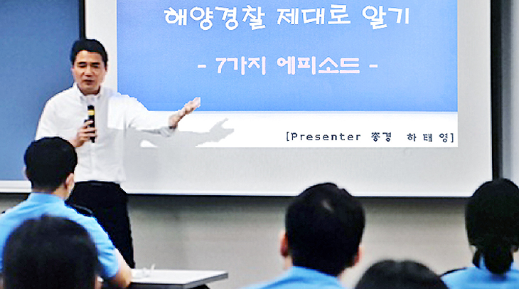 제주지방해양경찰청(청장 한상철)은 지난 14일 전라남도 여수시 해양경찰교육원에서 간부경채와 제248기 신임 순경 교육생 30여 명을 대상으로 '바다 위 정부종합청사, 해양경찰'이라는 주제로 특강을 실시했다.