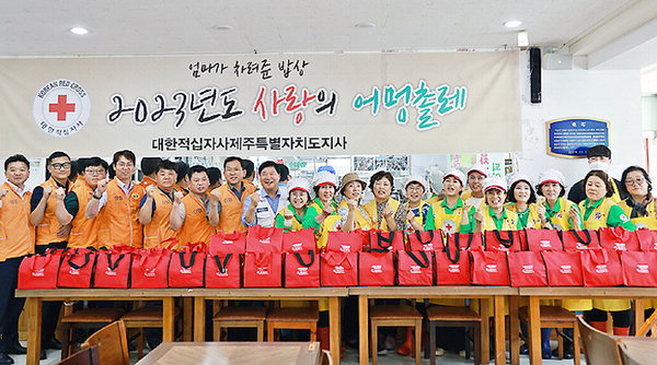 대한적십자사제주특별자치도지사(회장 정태근)는 지난 14일 서귀적십자봉사회(회장 이세열)와 제주지역신협 두손모아봉사단(단장 허두은)이 참여한 가운데 취약계층 101여가구에 사랑의 어멍촐레 밑반찬을 전달했다.