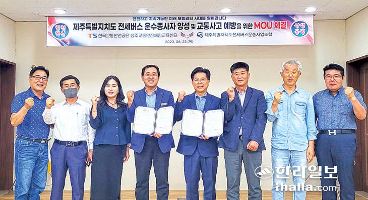 제주전세버스운송사업조합(이사장 박만혜)과 한국교통안전공단 상주 교통안전체험교육센터(센터장 조정권)가 22일 도내 전세버스 운수종사자 양성 및 운전역량을 강화시켜 교통사고 감소예방을 통해 안전한 제주 교통 환경 조성을 하기위한 업무협약을 체결했다.