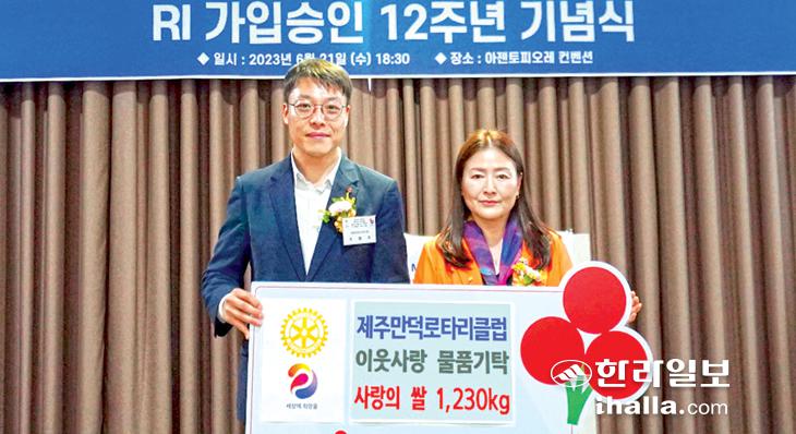 제주만덕로타리클럽(취임회장 문애순·이임회장 장희순)은 22일 아젠토피오레컨벤션 연회장에서 회장 및 임원, 이사 이취임식과 RI 가입승인 12주년 기념식을 갖고 사랑의 쌀 1230㎏을 제주사회복지공동모금회(회장 강지언)에 기탁했다. 이번 물품은 제주만덕로타리클럽 회장 및 임원·이사 이취임식과 RI(국제로타리) 가입승인을 기념해 보내온 쌀 화환을 기탁한 것으로, 이호동과 삼도2동 등을 통해 관내 어려운 이웃에게 전달될 예정이다.