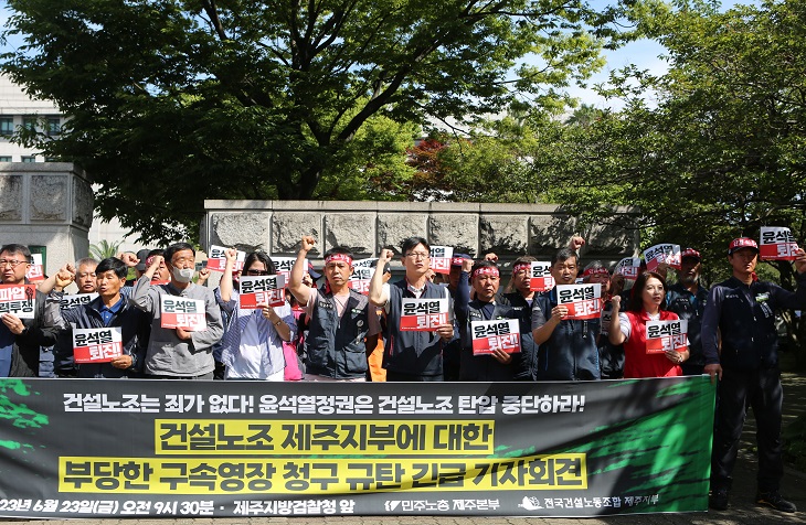 민주노총 제주본부와 건설노조 제주지부는 23일 제주지방검찰청 앞에서 기자회견을 하고 있다. 이상민 기자