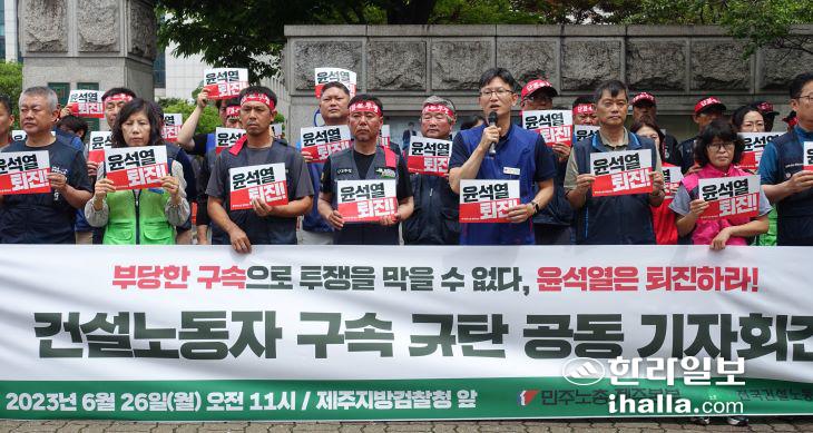 민주노총 제주본부와 건설노조 제주지부 관계자들이 26일 제주지방검찰청 앞에서 공동 기자회견을 열고 있다.