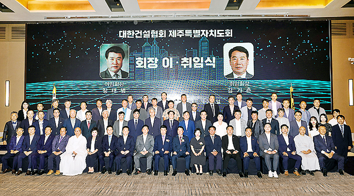 대한건설협회 제주자치도회는 26일 메종글래드제주호텔 컨벤션홀에서 제28대 장태범 회장 이임식과 제29대 김기춘 회장 취임식을 개최했다. 이날 4년동안 제주자치도의 지역경제 활성화와 건설산업 발전을 위해 애쓴 장태범 회장에 오영훈 제주도지사 감사패를 수여했다.