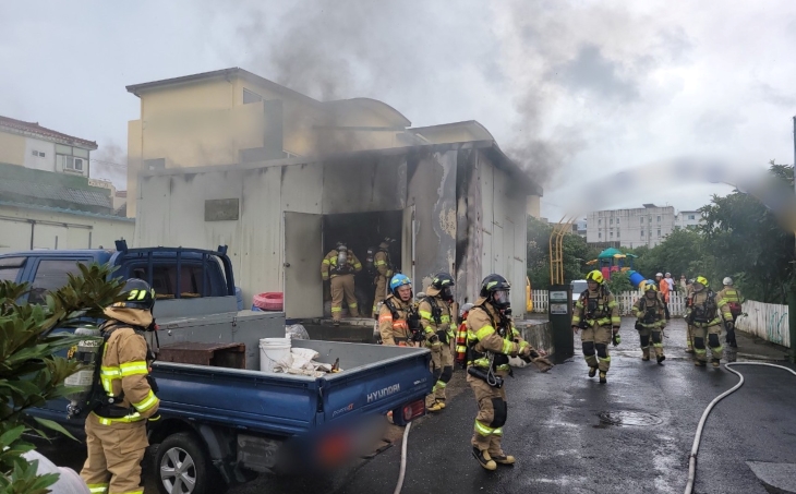 지난 27일 발생한 창고 화재 현장에서 소방대원들이 진화작업을 벌이고 있다. 제주소방서 제공