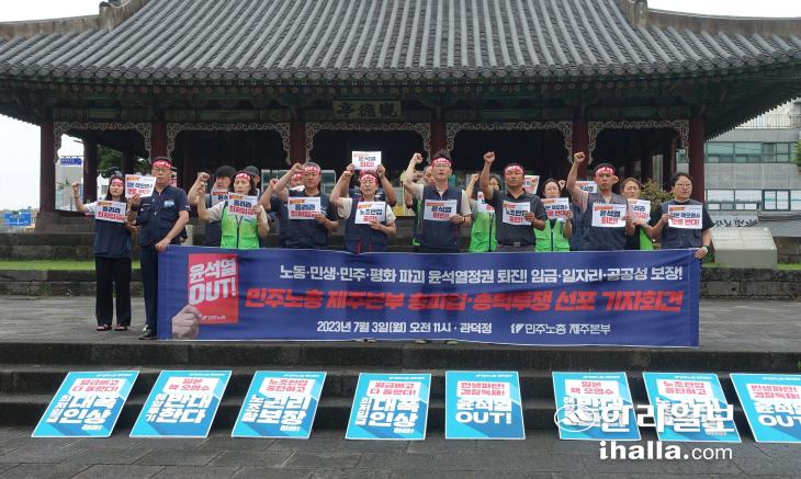 민주노총 제주본부 관계자들이 3일 제주시 관덕정 앞에서 총파업·총력투쟁 선포 기자회견을 열고 있다.