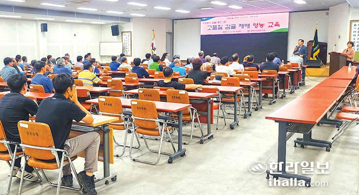 중문농협(조합장 김성범)은 지난 5일 유통사업단 교육장에서 노지감귤 공선출하회원 70여명을 대상으로 고품질 감귤 생산을 위한 재배교육을 실시했다. 교육은 강만희 강사(서귀포시 감귤 명인 1호)를 초청해 차별화된 감귤 재배기술 방법을 강의했는데, 2022년산 최고 경매가(3㎏에 8만5000원) 기록 등 개인 노하우 비법을 전수해 농가들의 호응을 얻었다.