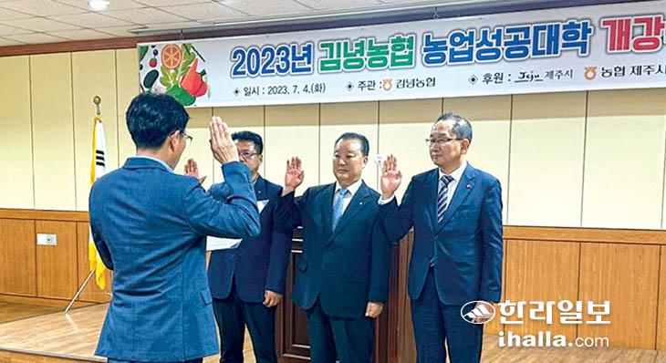 김녕농협(조합장 오충규)은 지난 4일 김녕농협 종합유통센터 2층 회의장에서 농업성공대학 제8기 개강식을 개최했다. 농업성공대학은 변화하는 농업환경에 발맞춰 전문농업 경영지식 함양을 위한 과정으로 운영되며, 김녕농협에서 7월~9월까지 주 2회 강의를 진행한다.