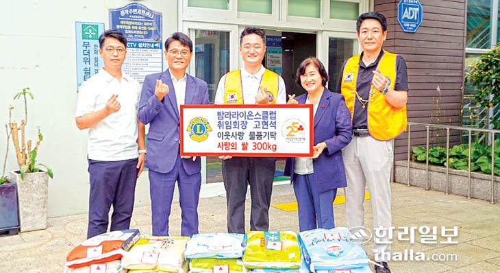국제라이온스클럽 354-G 제주지구 탐라라이온스클럽(회장 고현석)은 지난 7일 제주시 삼양동주민센터(동장 고상익)에서 사랑의 쌀 300㎏을 제주사회복지공동모금회(회장 강지언)에 기탁했다.
