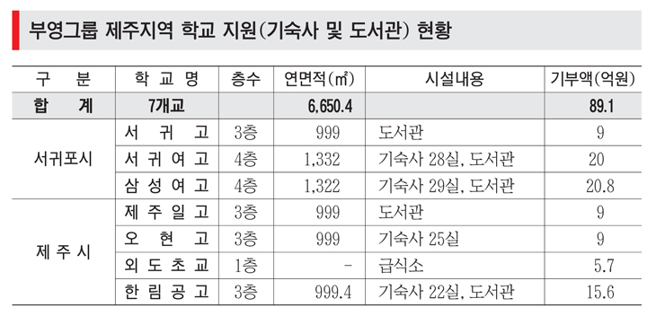 부영그룹은 지난 2000년부터 서귀포고를 시작으로 도서관과 기숙사, 급식소 시설을 지어 기증했다. 부영그룹이 도서관 기숙사 시설 등을 지원한 학교는 서귀포고, 서귀포여고, 삼성여고, 제주일고, 오현고, 외도초, 한림공고 등 7개교이며 지원금액은 90억원에 이른다.