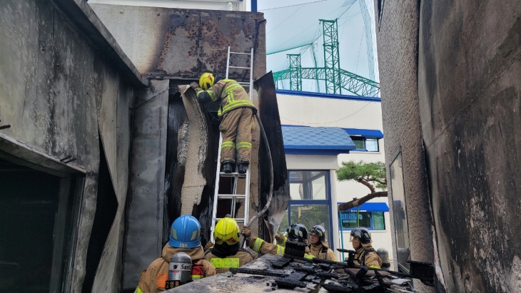 지난 14일 제주시 노형동의 창고 화재를 소방대원들이 진화하고 있다. 제주소방서 제공