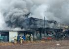 18일 오전 제주시 외도동에서 발생한 전기 자재 업체 화재를 소방대원들이 진화하고 있다. 강희만기자