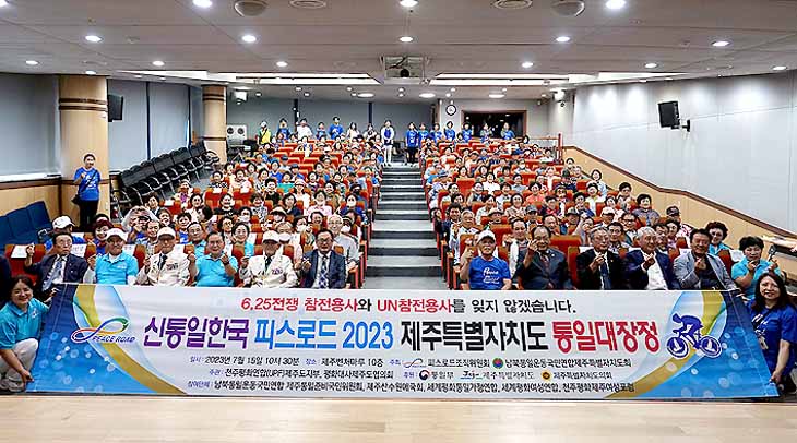 정전협정 70주년을 맞아 6·25 참전용사와 유엔군 용사의 희생정신을 기리고, 한반도 통일과 세계평화를 기원하며 전 세계인이 함께 달리는 '신통일한국 피스로드 2023 제주도 통일대장정' 행사가 지난 15일 제주벤처마루에서 시민 200여 명이 참석한 가운데 개최됐다.